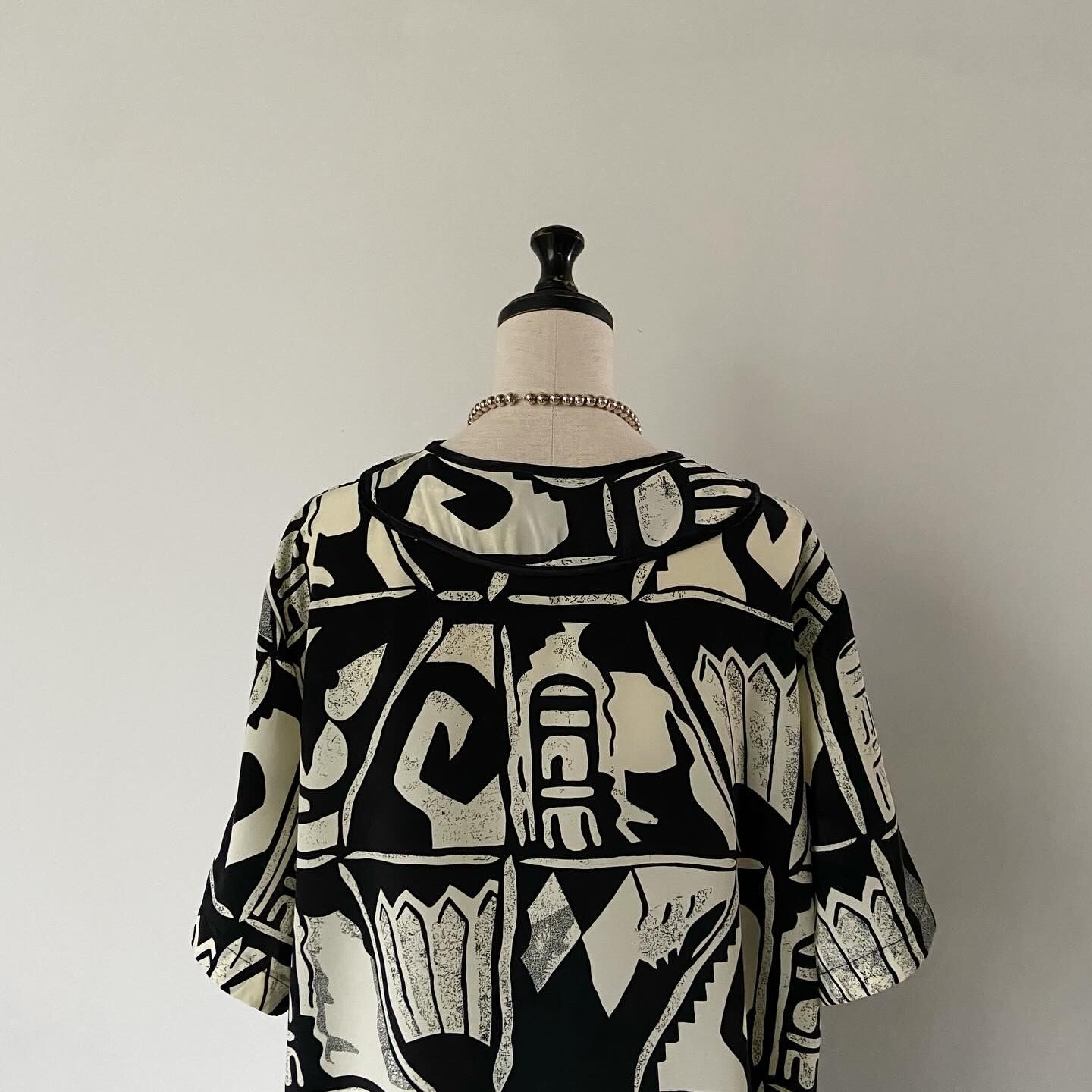 どこか民族的な雰囲気の柄が印象的なワンピースです。