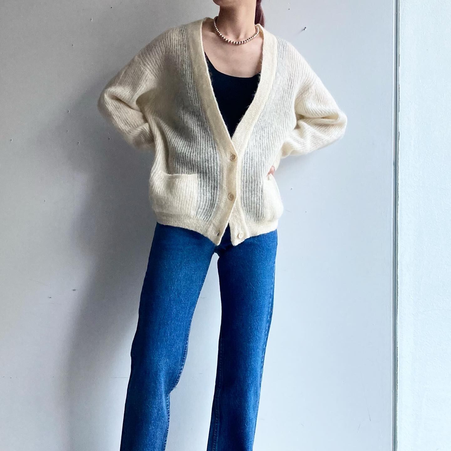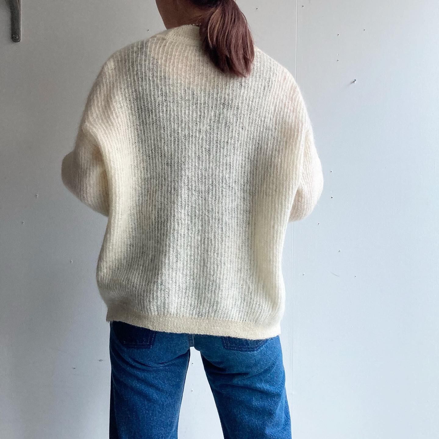 若干透けるように甘く編み立てられた本体と、深めのVネックのバランスが絶妙で、シンプルながらも女性らしさが漂うデザインです。