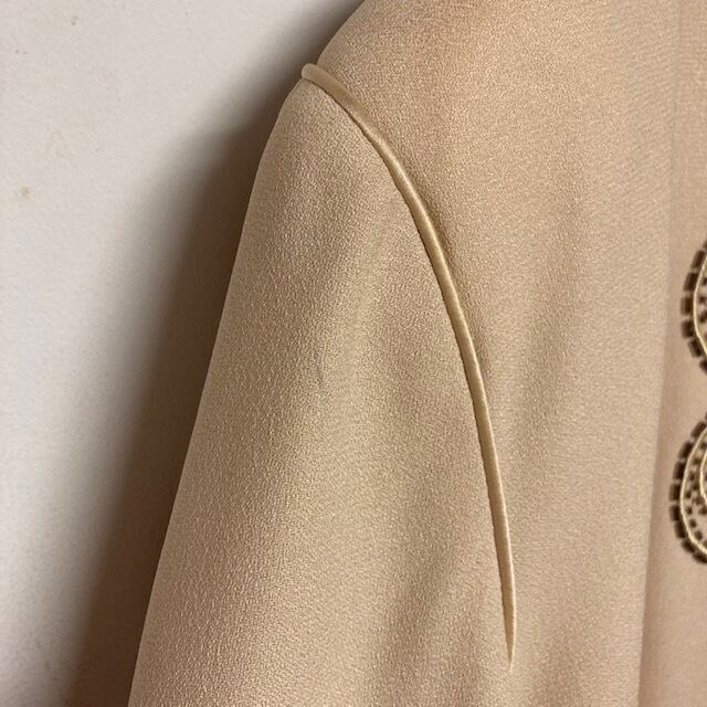 ビーズ刺繍とカットアウト、ペプラム調のデザインが女性的なジャケットです。