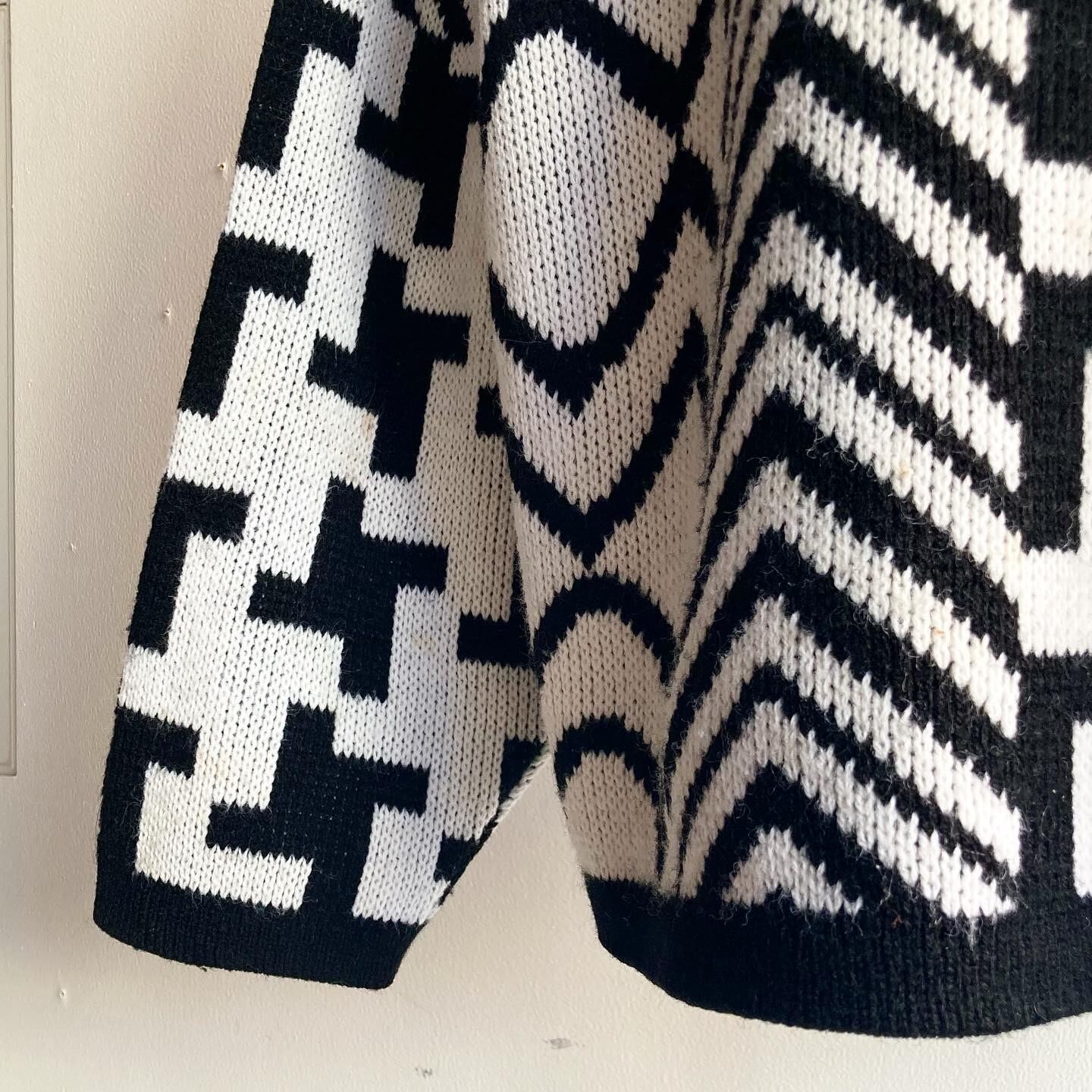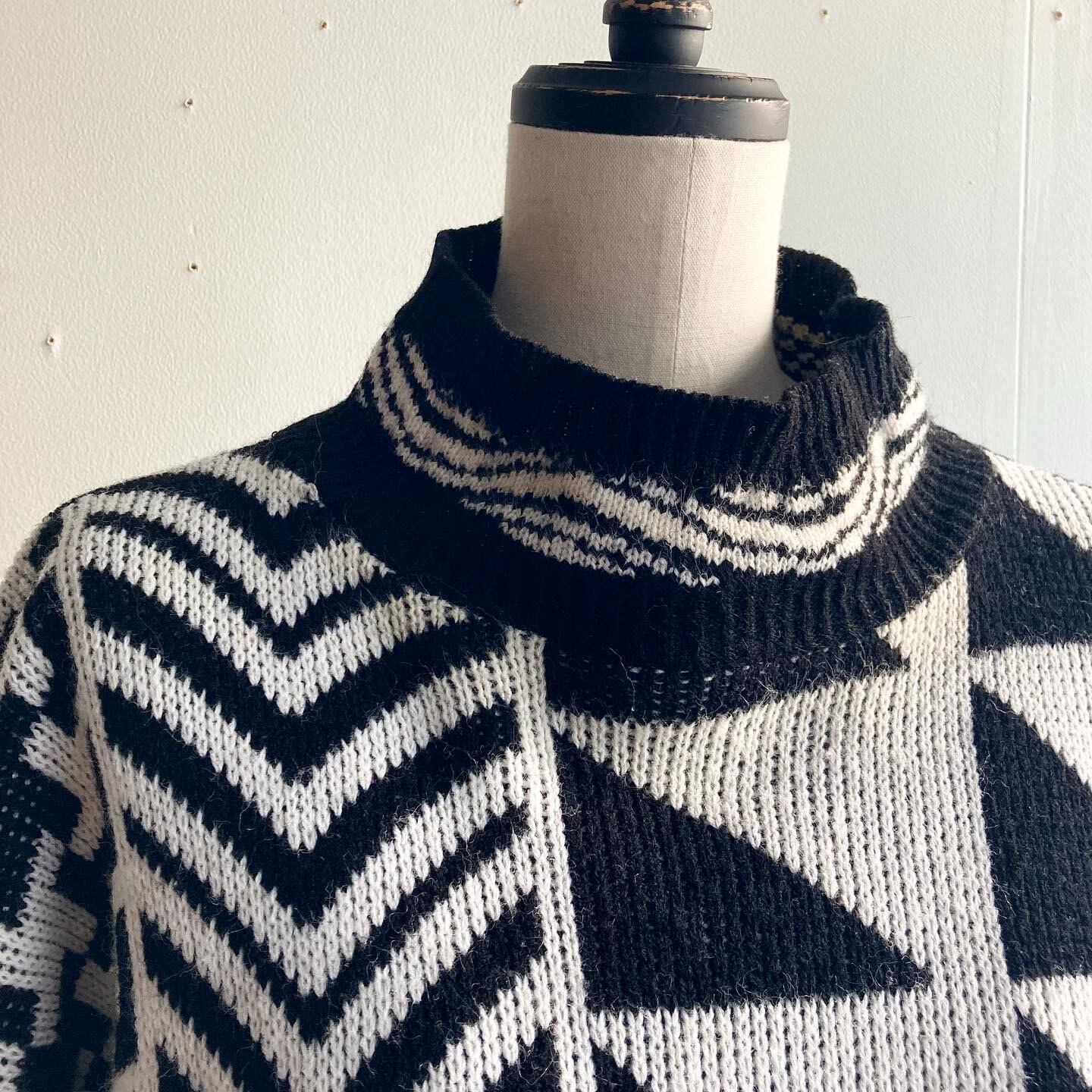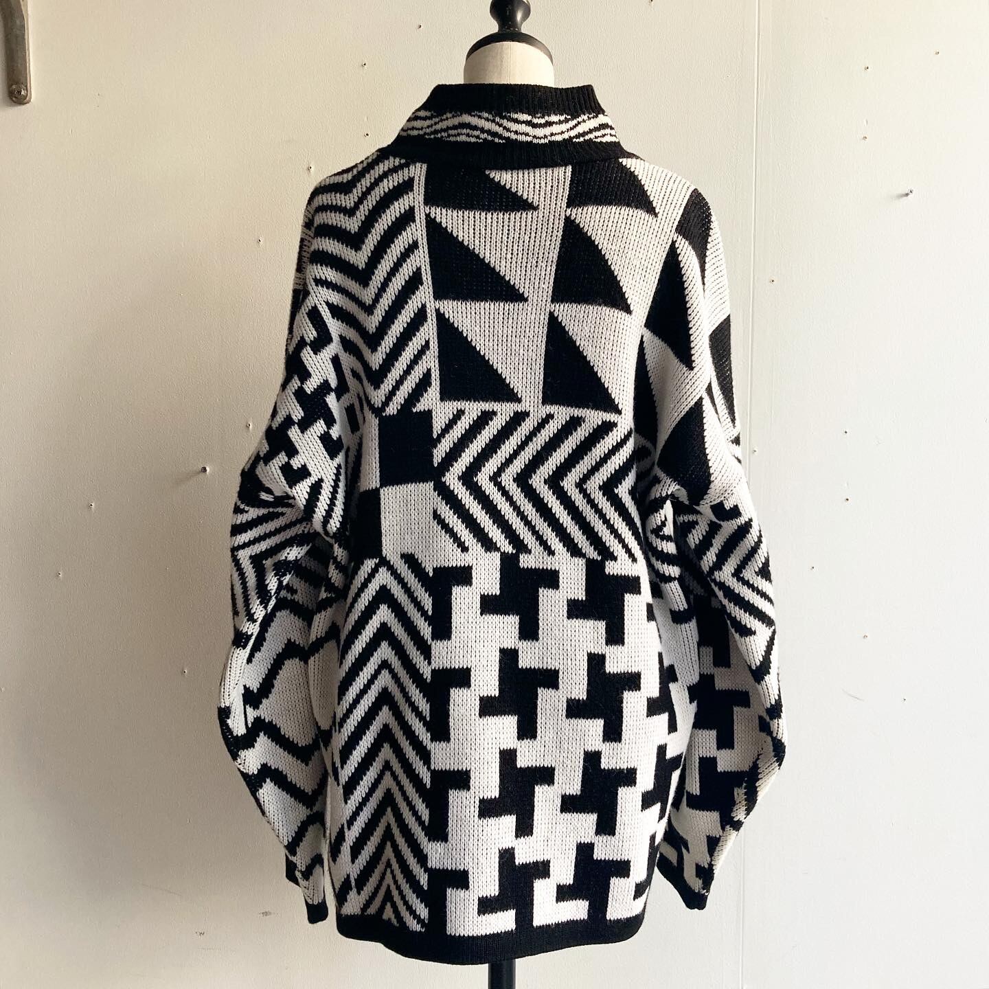 拡大した幾何学模様がモノトーンで表現されており、民族的とも都会的とも受け取れる不思議な印象のニットです。