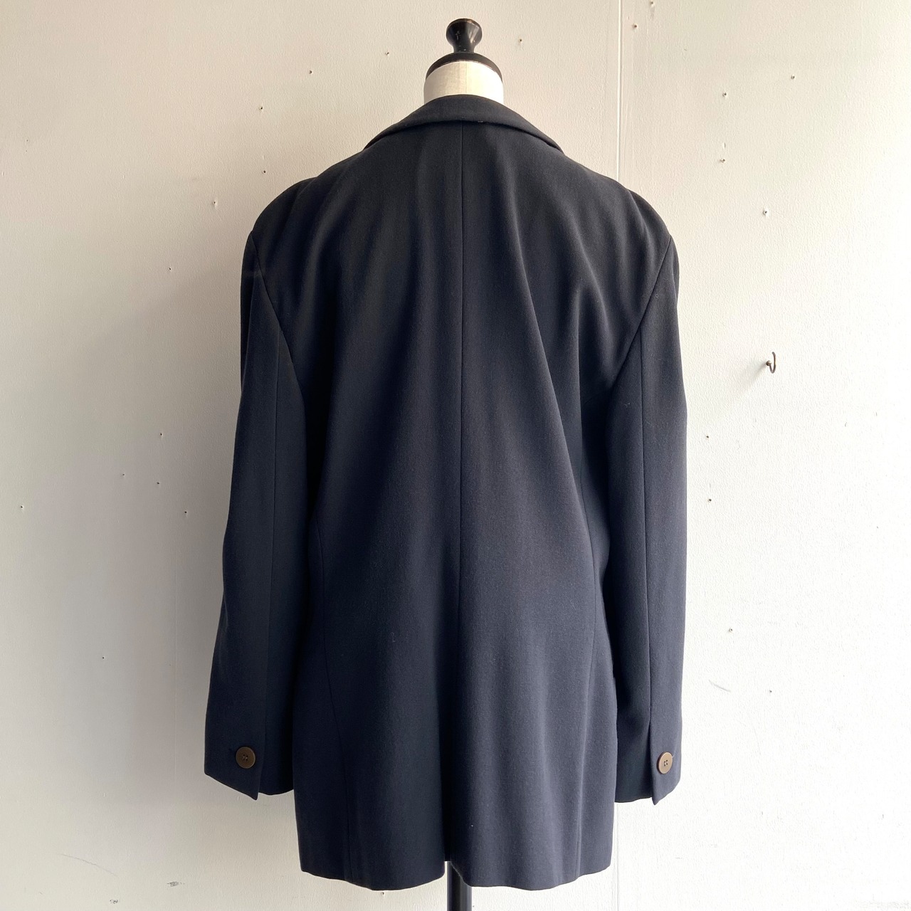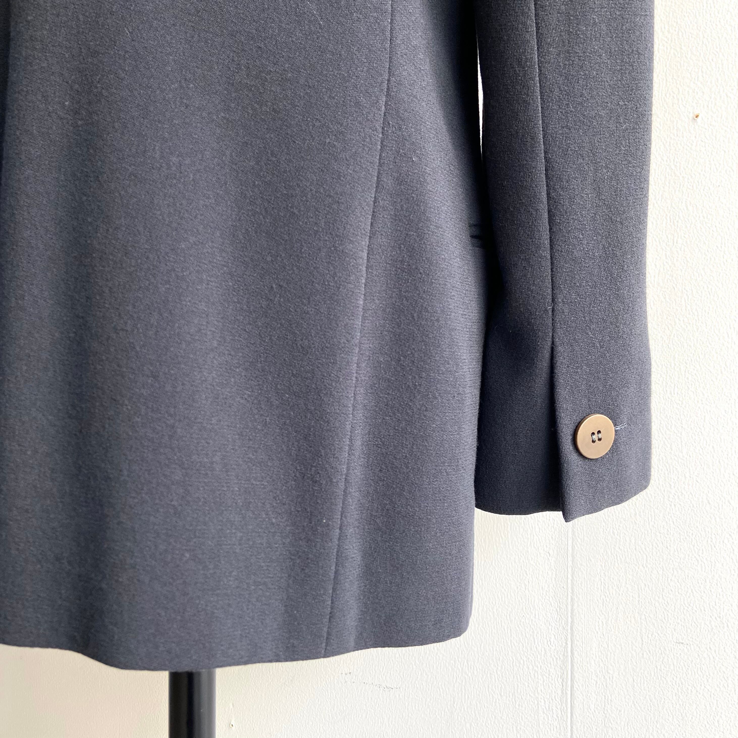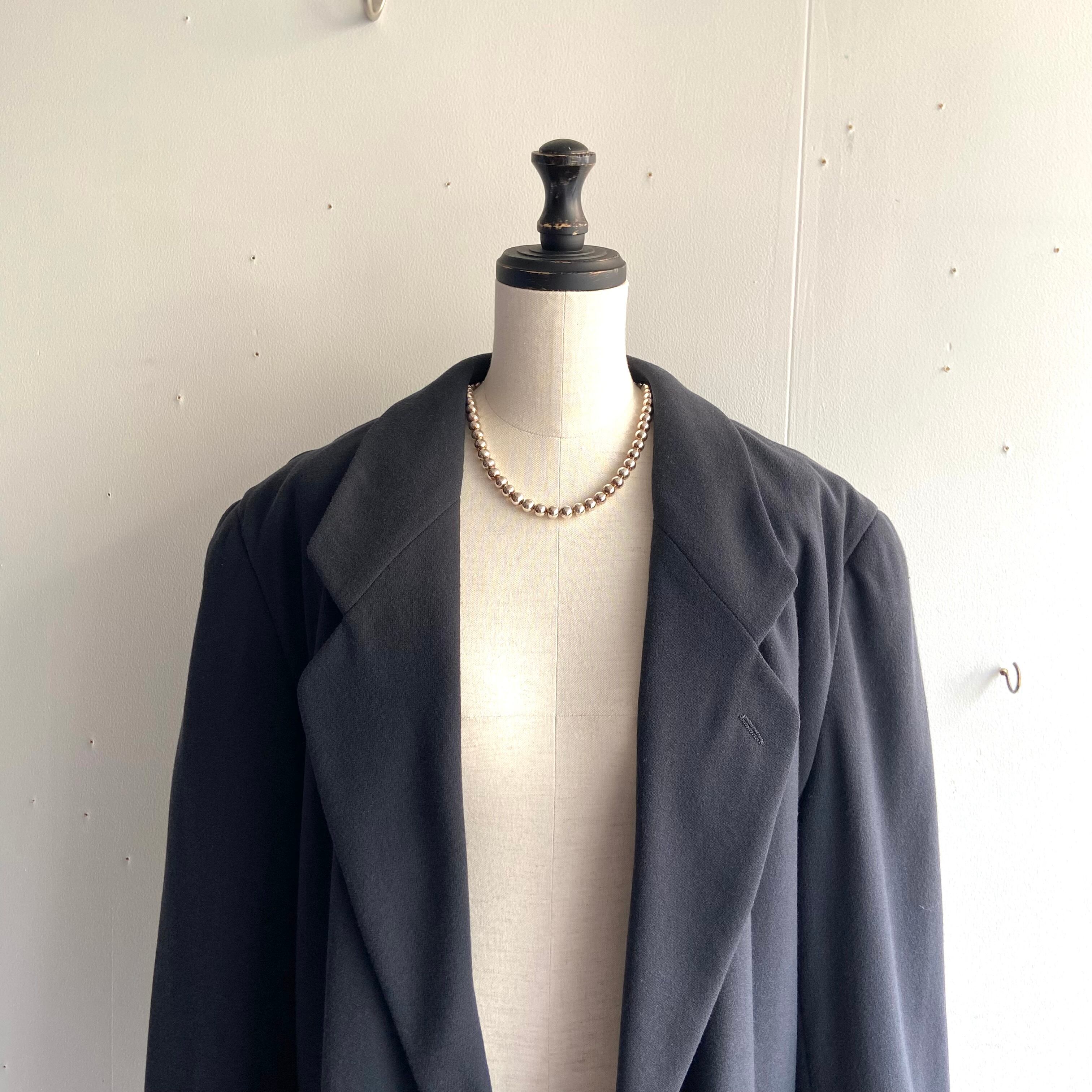 フロントは曲線的なデザインになっており、基本的には羽織るスタイルなのだと思われますが、釦を留めて着用いただくとコントラストの効いた面白いシルエットになります。